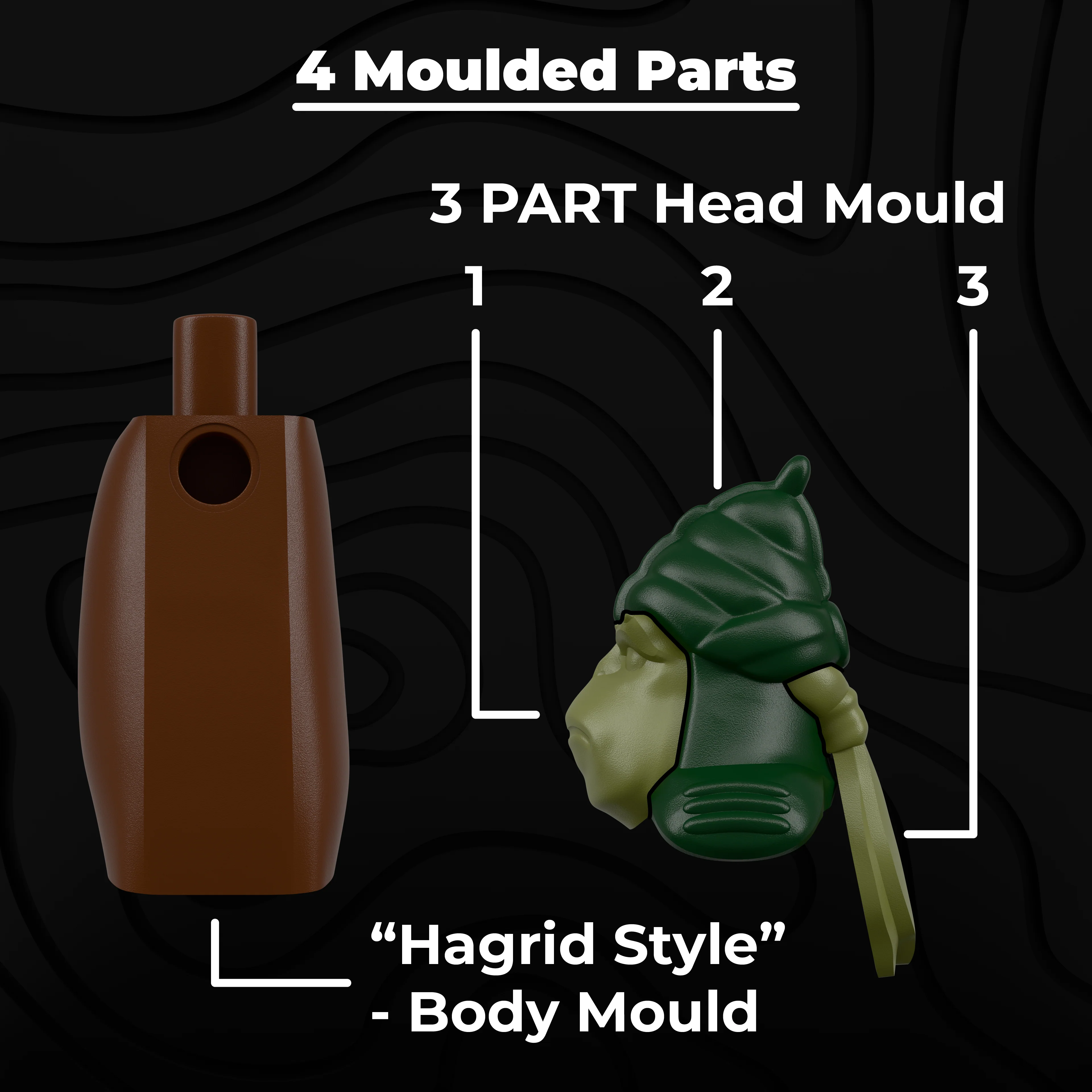 4 side pad printed figure. Custom ABS Body Piece (Hagrid Style), and A Triple Moulded Headpiece. Featuring multiple painted elements, pad printed on custom and official parts (Legs, Arms and Hands).